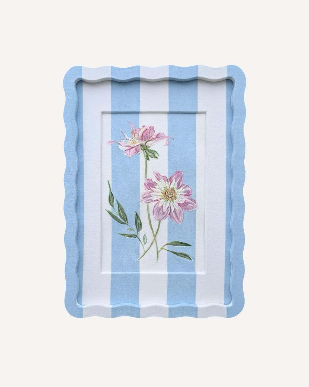 One of a kind, hand painted dahlia by Polly Wolly Doodles, on blue and white striped fabric, enclosed in an Alma wiggle - perfection!! A5 frames come with hanger for wall hanging and stand.