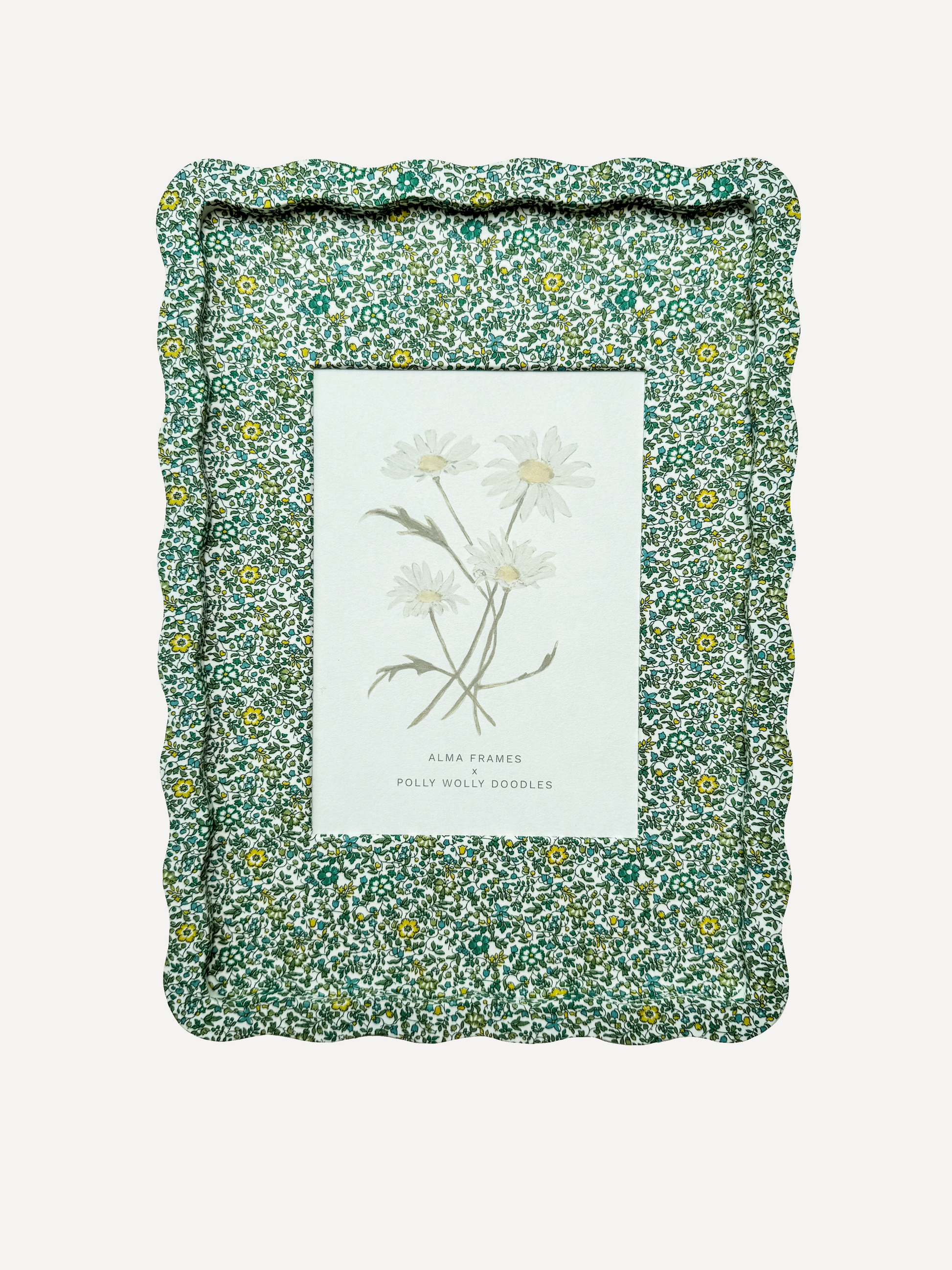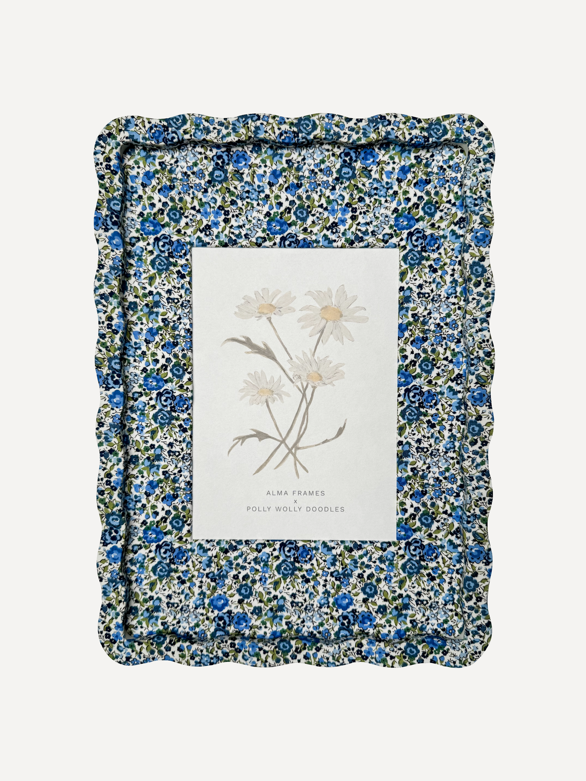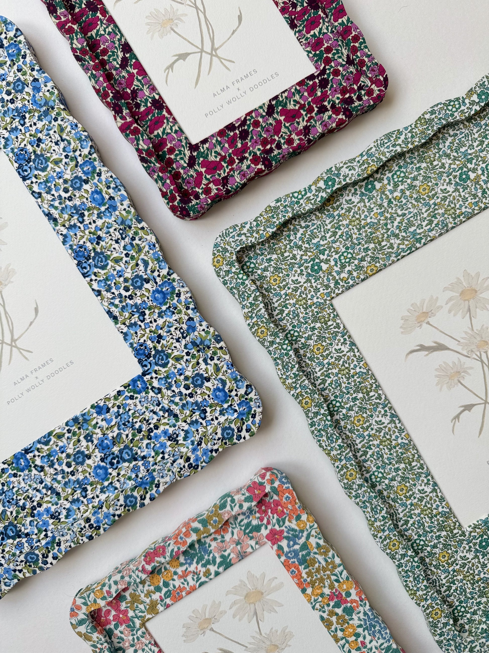Alma Frames x Polly Wolly Doodles A4 Wiggle Frame covered with vintage Liberty Tana Lawn fabric, available exclusively on almaframes.com and in Liberty London. A unique and beautiful way to hold your treasured photos and art. A4 frames hold a 5x7in photo and include a hanger for wall hanging portrait or landscape.