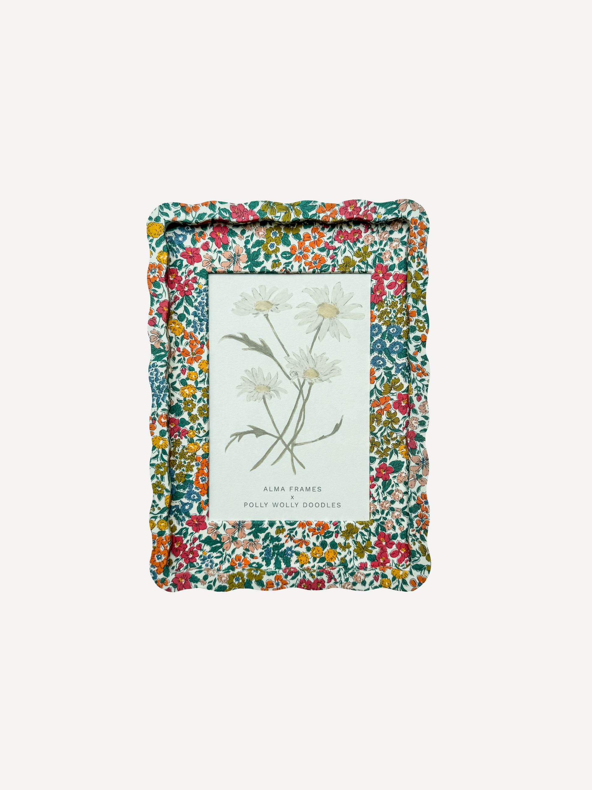 Alma Frames x Polly Wolly Doodles A5 Wiggle Frame covered with vintage Liberty Tana Lawn fabric, available exclusively on almaframes.com and in Liberty London. A unique and beautiful way to hold your treasured photos and art. A5 frames hold a 6x4in photo and include a hanger for wall hanging and removable stand, both portrait or landscape.