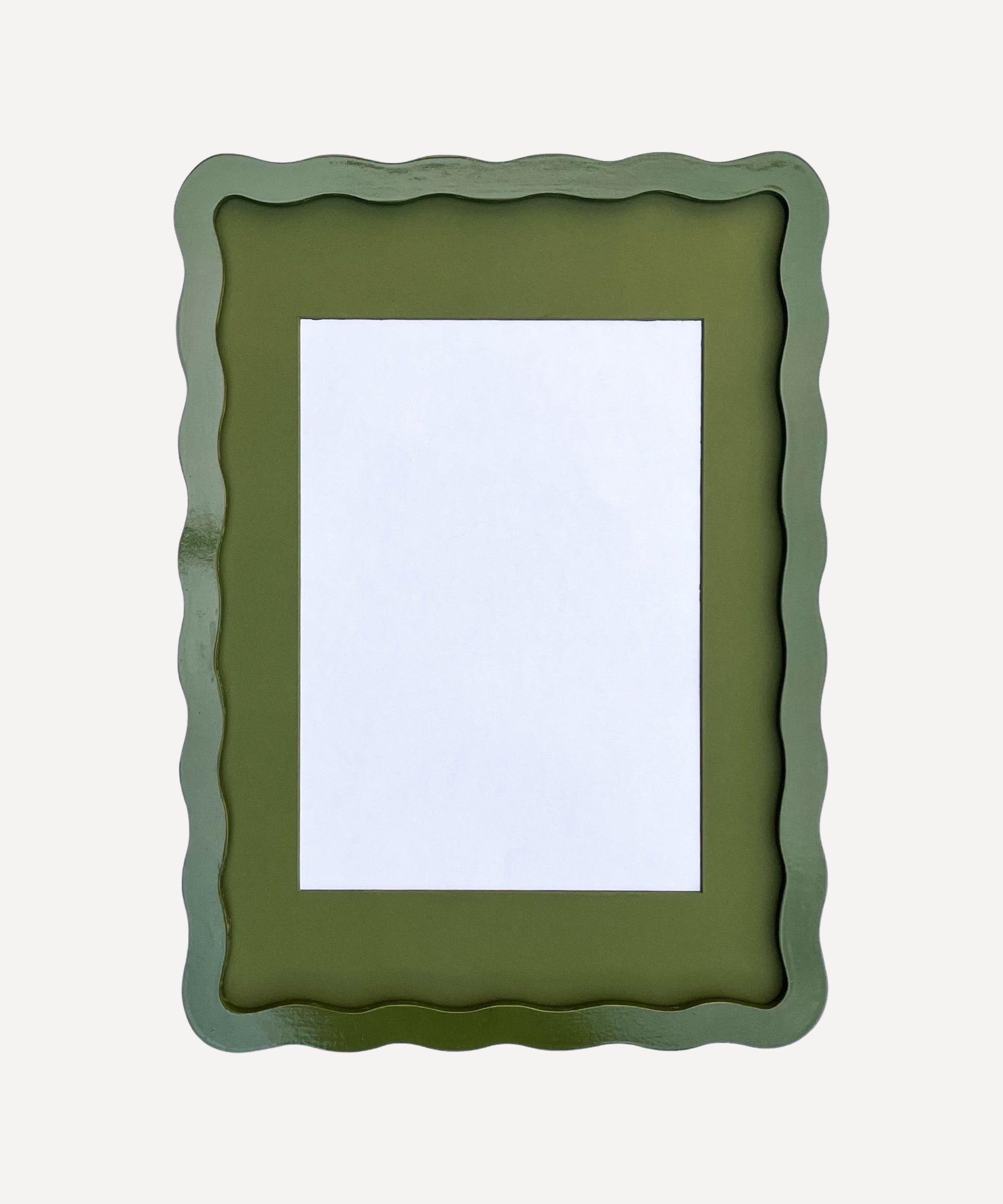 A3 wiggle frame spray painted in Olive Green gloss. Each wavy frame comes with a snow white mount as standard, real glass, and brass fixings for portrait or landscape hanging. Frame holds A3 print (297x410mm). With mount aperture holds A4 print (210x297mm).