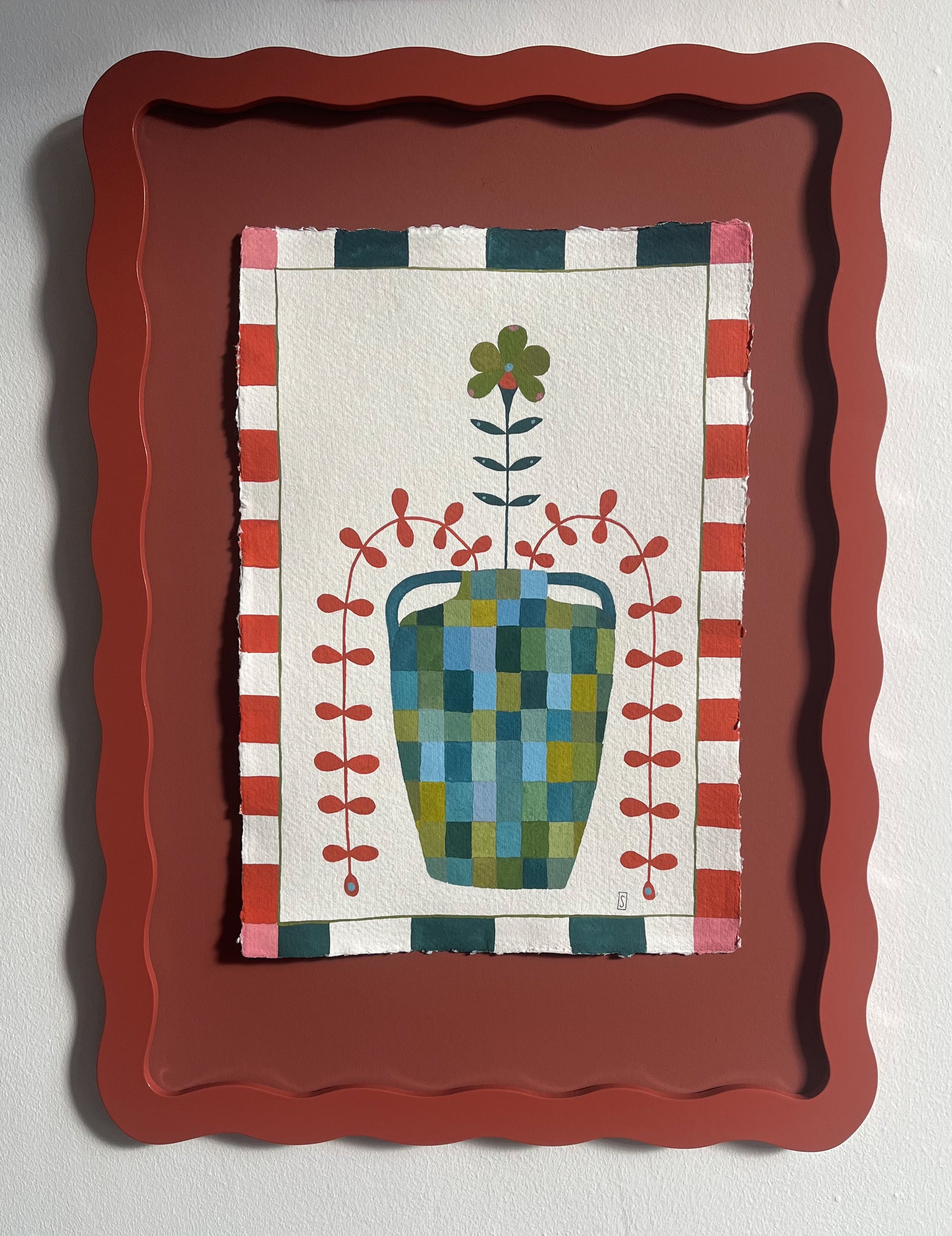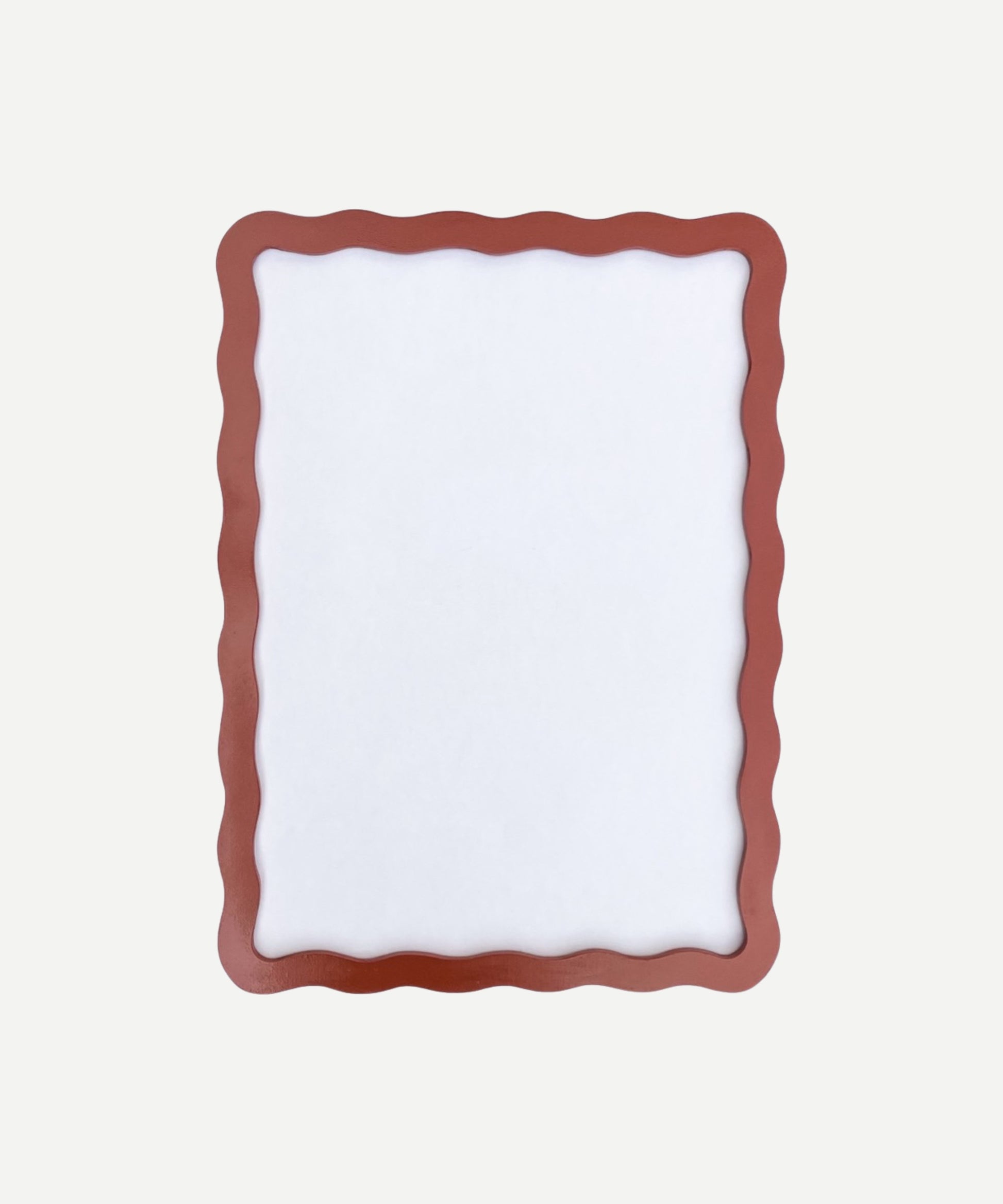 A3 wiggle frame spray painted in Oxblood Red gloss. Each wavy frame comes with a snow white mount as standard, real glass, and brass fixings for portrait or landscape hanging. Frame holds A3 print (297x410mm). With mount aperture holds A4 print (210x297mm).