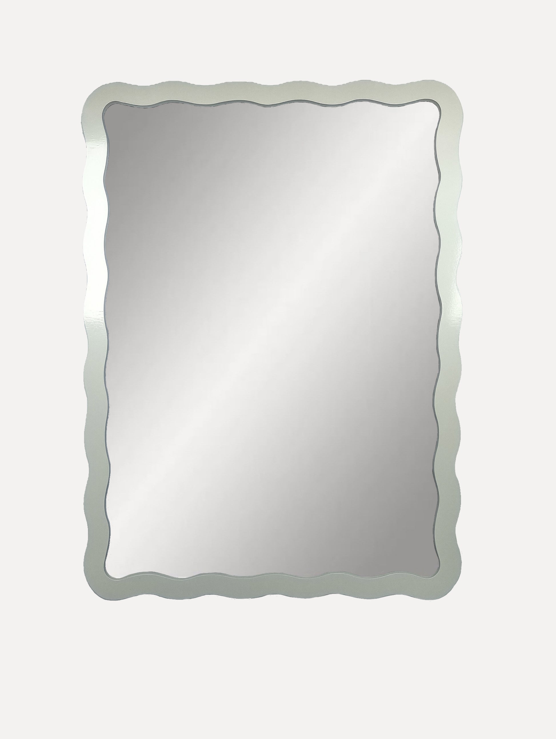 Shimmy Mirror spray painted in Soft White gloss. Available in Medium (H45 x W32.5 x D1.2cm) and Large (H62 x W45.5 x D1.2cm). Each wavy mirror has brass fixings for portrait or landscape hanging.
