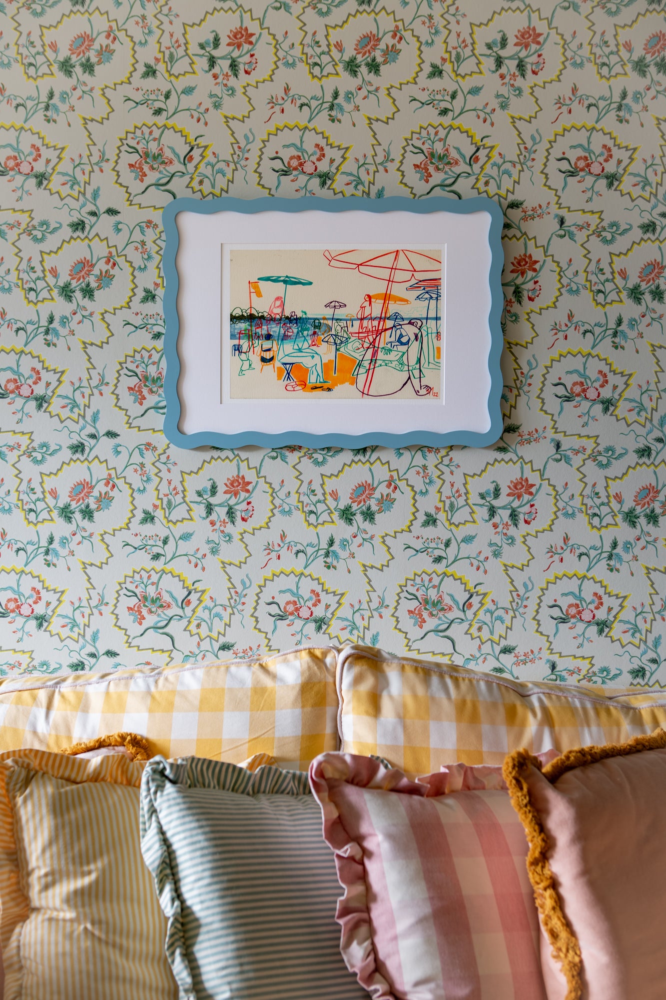 A2 wiggle frame spray painted in Stone Blue gloss. Each wavy frame comes with a snow white mount as standard, acrylic glass, and brass fixings for portrait or landscape hanging. Frame holds A2 print (420x594mm). With mount aperture holds A3 print (297x420mm).