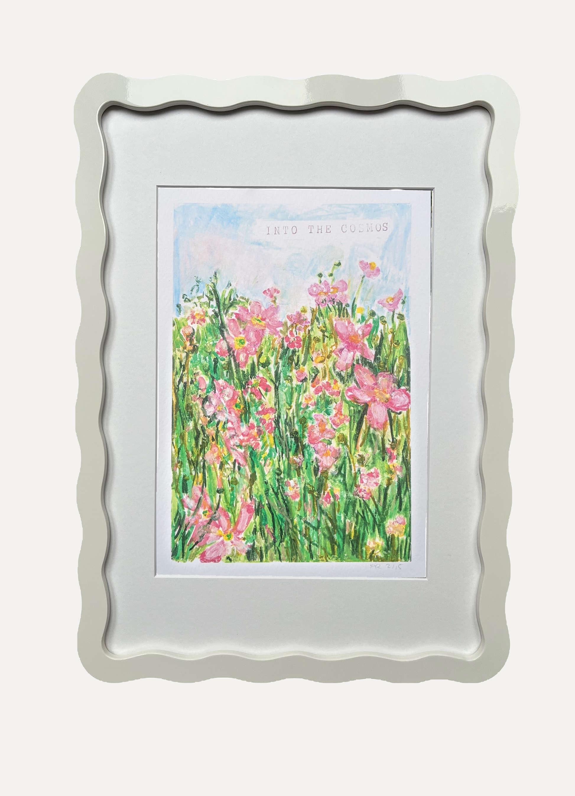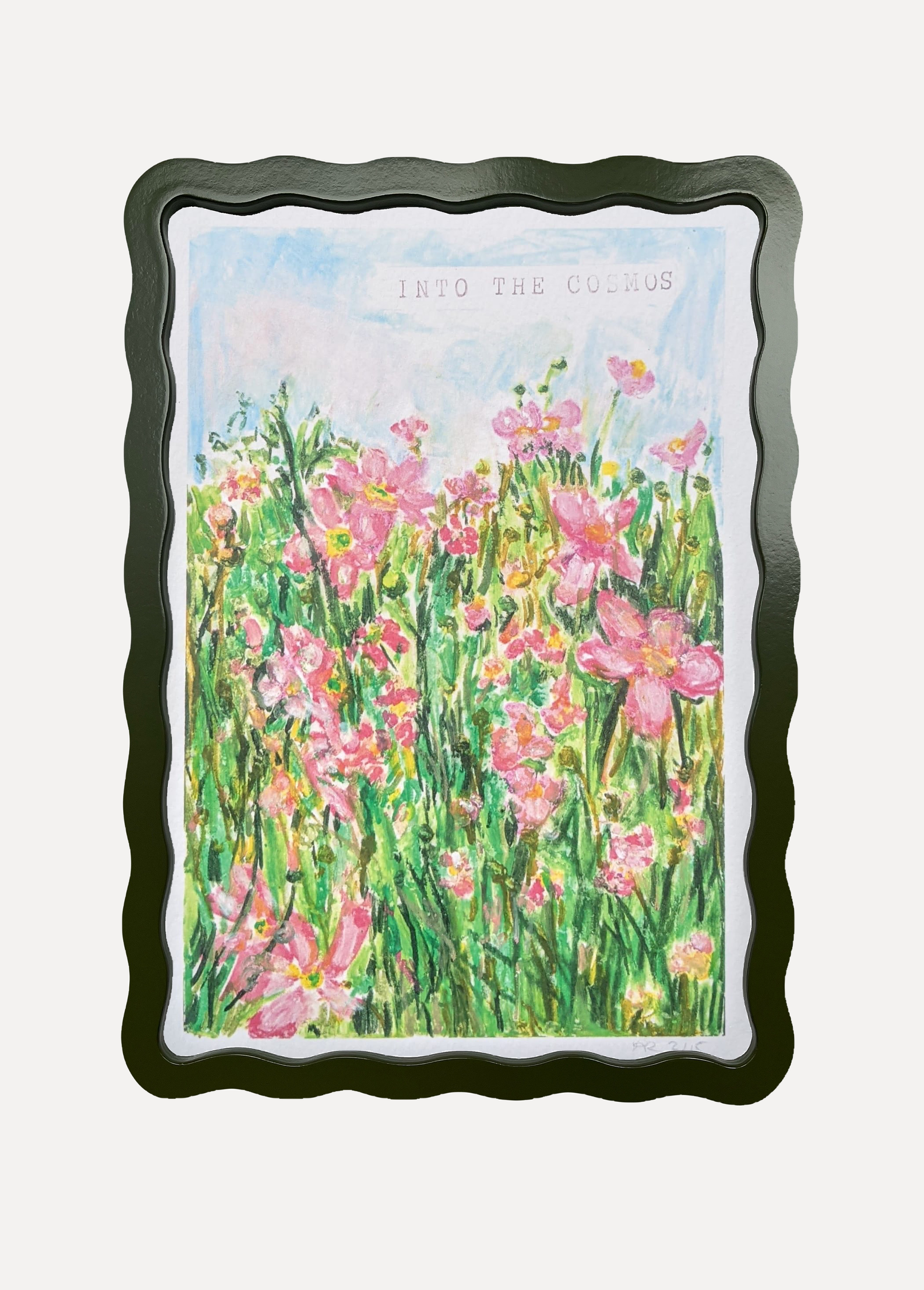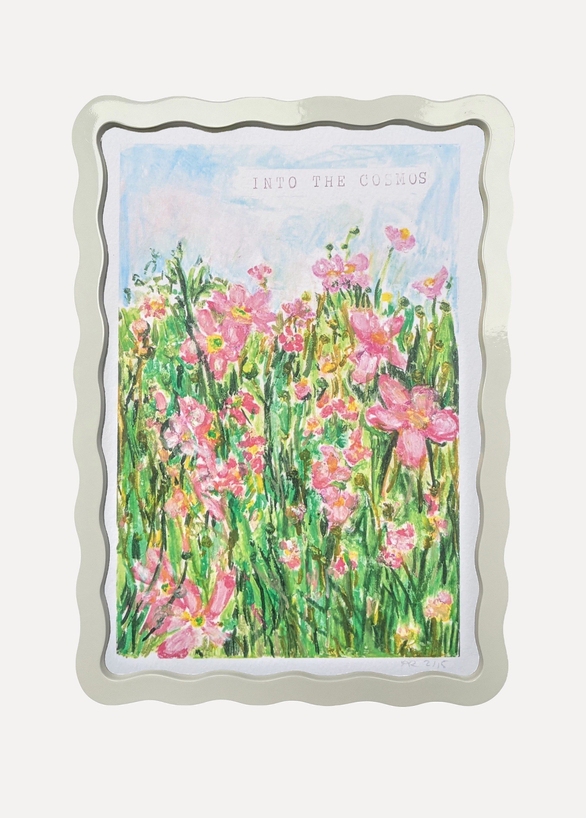 Alma x Polly Wolly Doodles Into the Cosmos Print in A5 or A4 Wiggle Frame. Available in all six Alma colours, with snow white mount for A4 frame. Glazed with real glass with brass fixings for hanging.