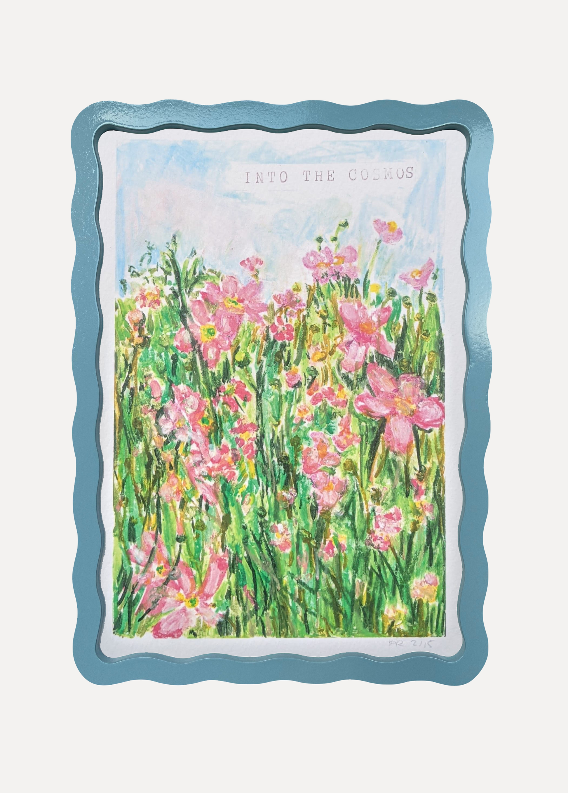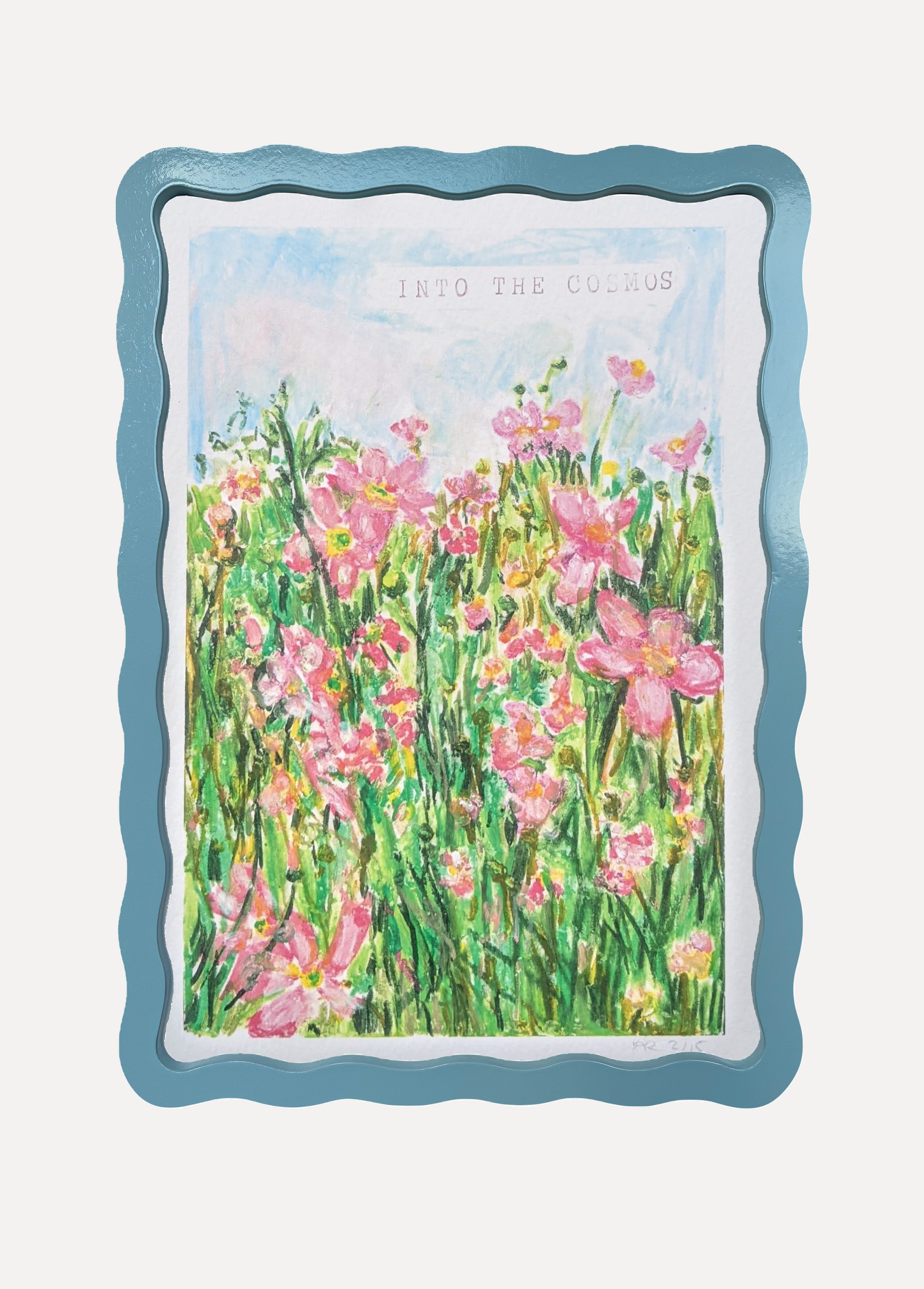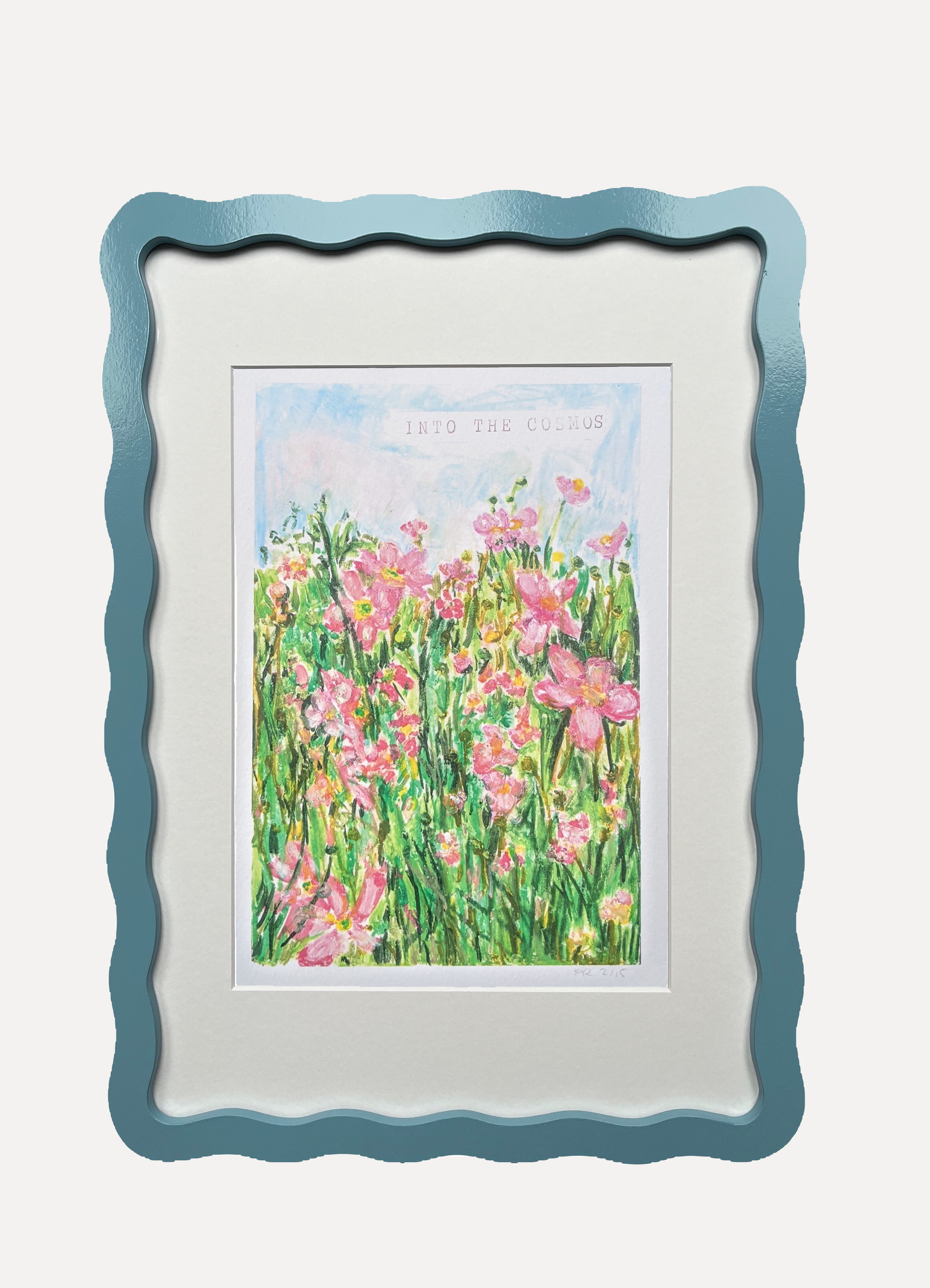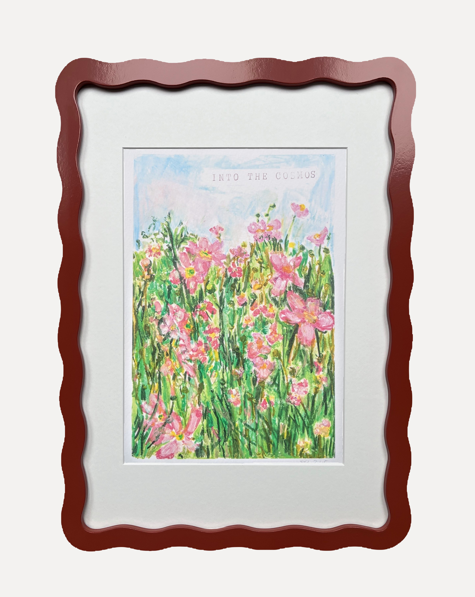 Alma x Polly Wolly Doodles Into the Cosmos Print in A5 or A4 Wiggle Frame. Available in all six Alma colours, with snow white mount for A4 frame. Glazed with real glass with brass fixings for hanging.