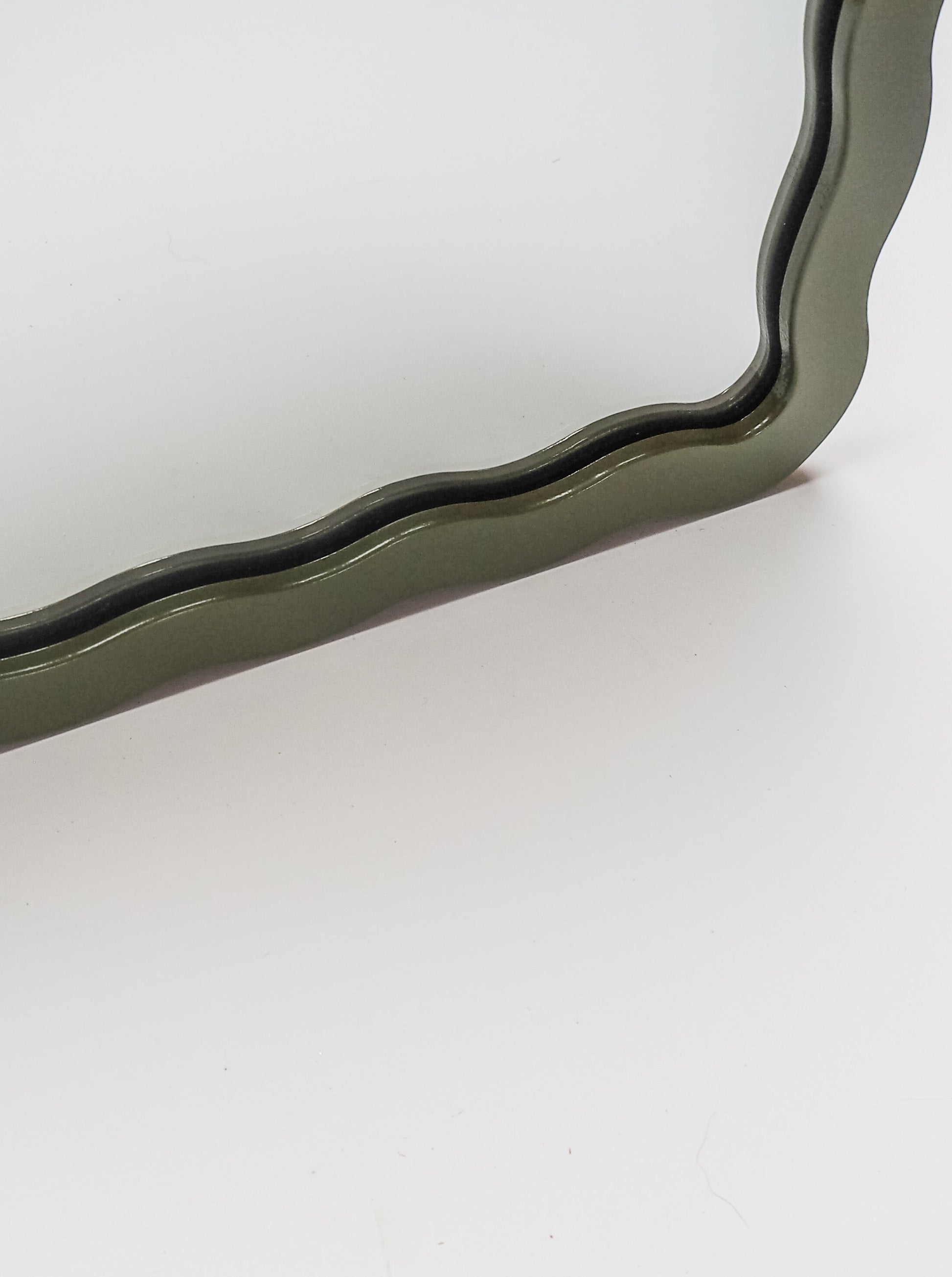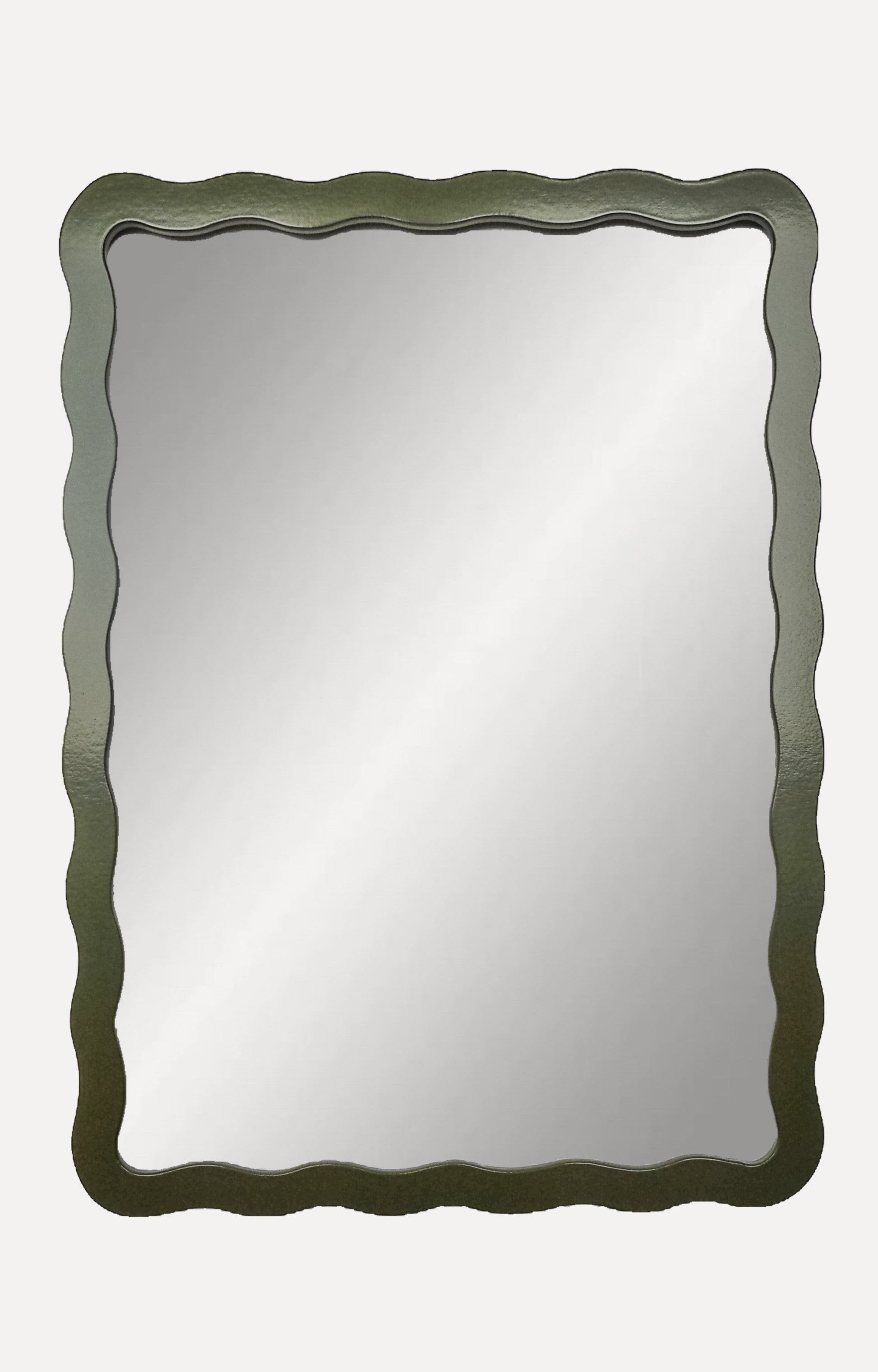 Shimmy Mirror spray painted in Olive Green gloss. Available in Medium (H45 x W32.5 x D1.2cm) and Large (H62 x W45.5 x D1.2cm). Each wavy mirror has brass fixings for portrait or landscape hanging.