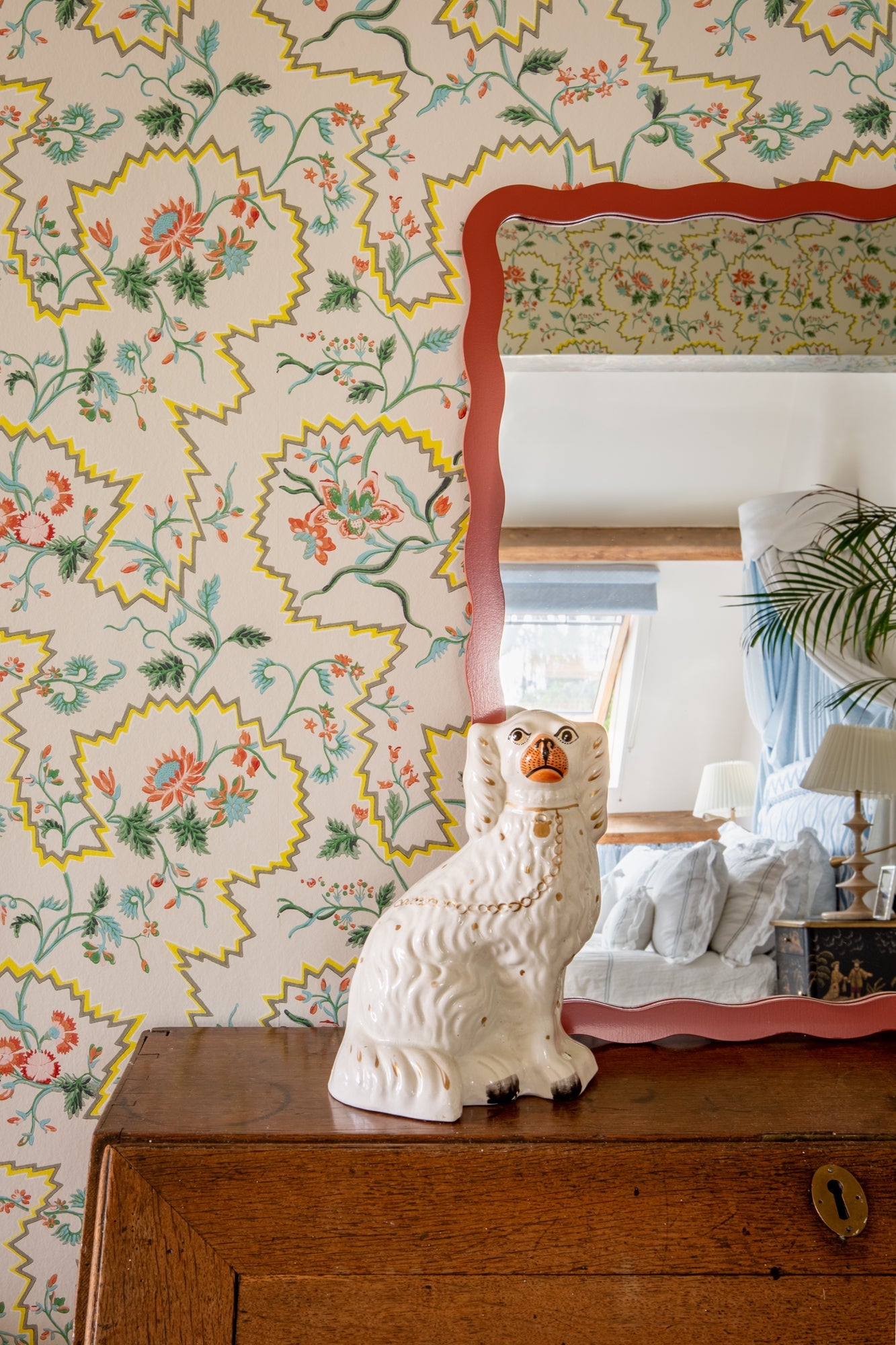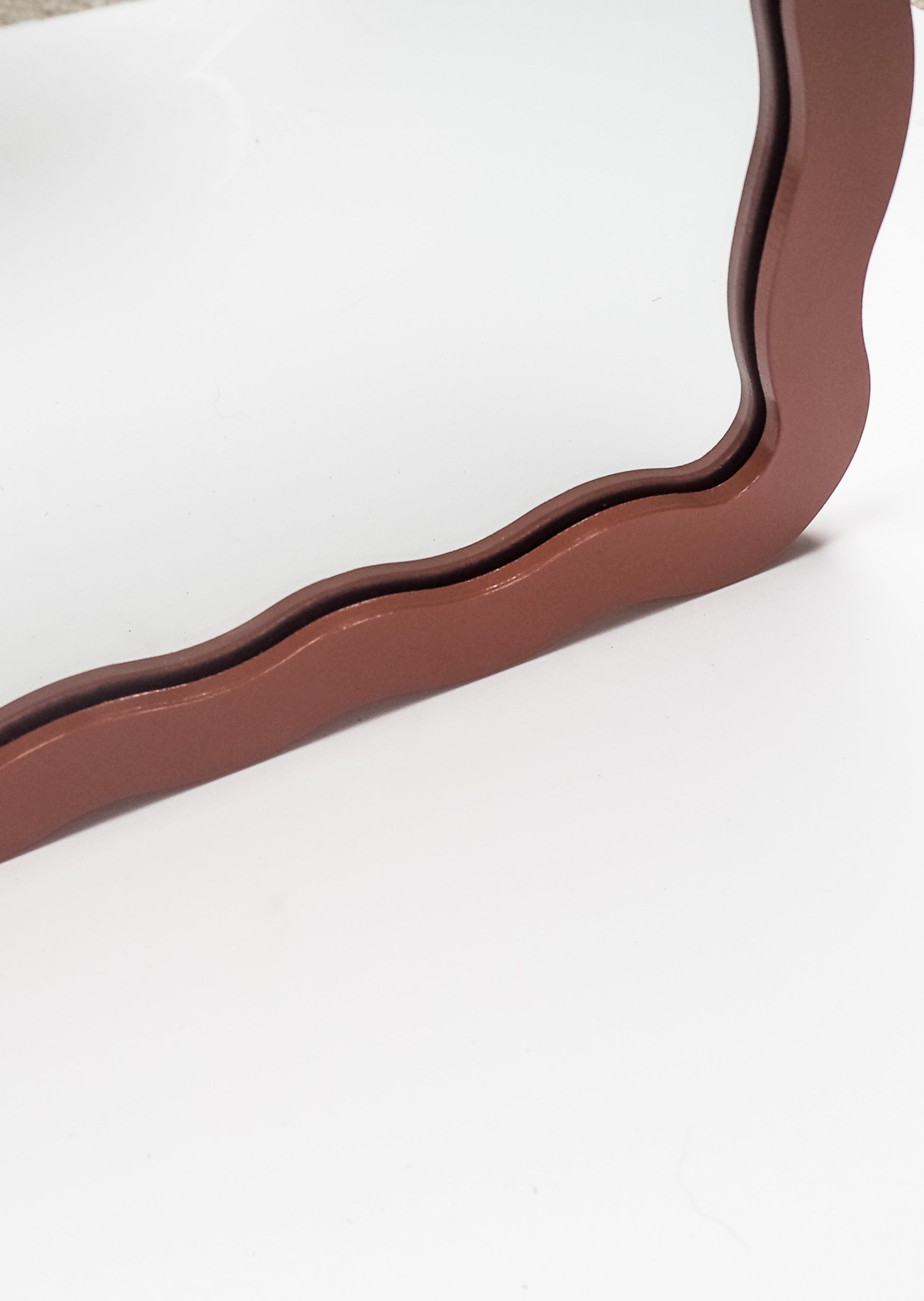 Shimmy Mirror spray painted in Oxblood Red gloss. Available in Medium (H45 x W32.5 x D1.2cm) and Large (H62 x W45.5 x D1.2cm). Each wavy mirror has brass fixings for portrait or landscape hanging.