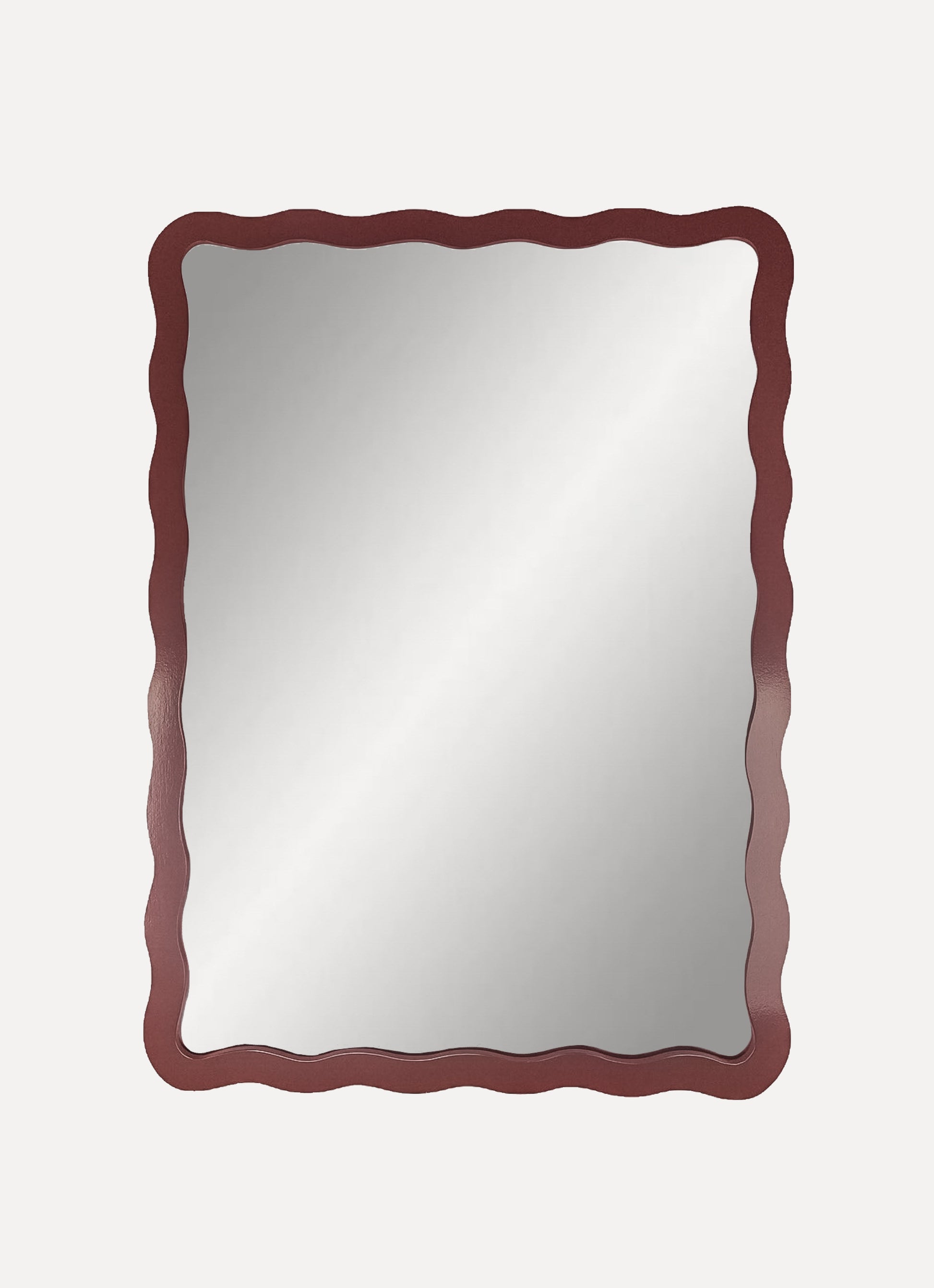 Shimmy Mirror spray painted in Oxblood Red gloss. Available in Medium (H45 x W32.5 x D1.2cm) and Large (H62 x W45.5 x D1.2cm). Each wavy mirror has brass fixings for portrait or landscape hanging.