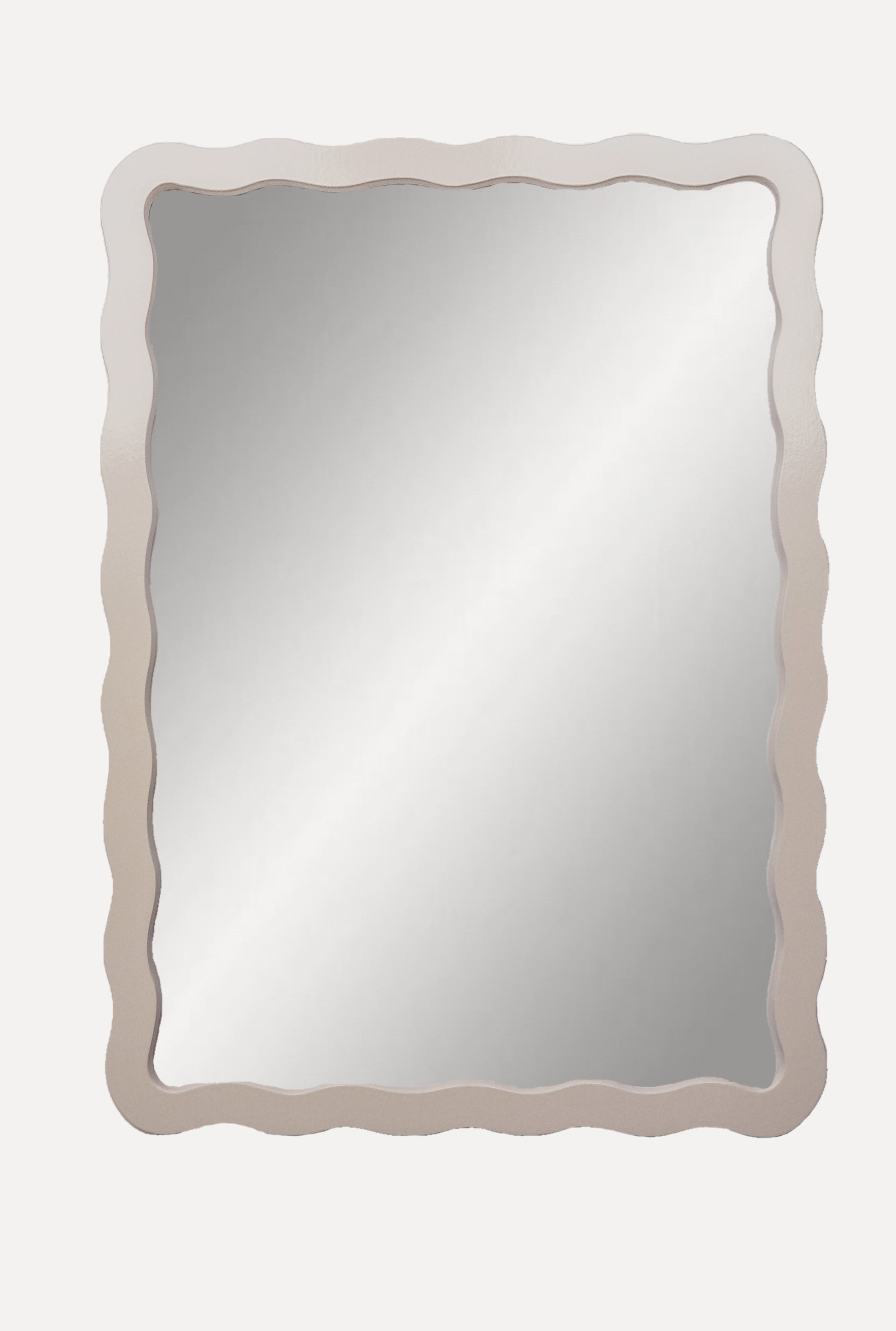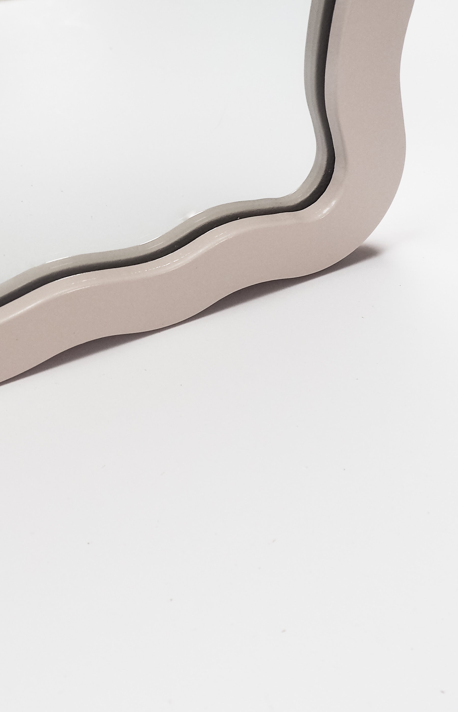 Shimmy Mirror spray painted in Palest Pink gloss. Available in Medium (H45 x W32.5 x D1.2cm) and Large (H62 x W45.5 x D1.2cm). Each wavy mirror has brass fixings for portrait or landscape hanging.