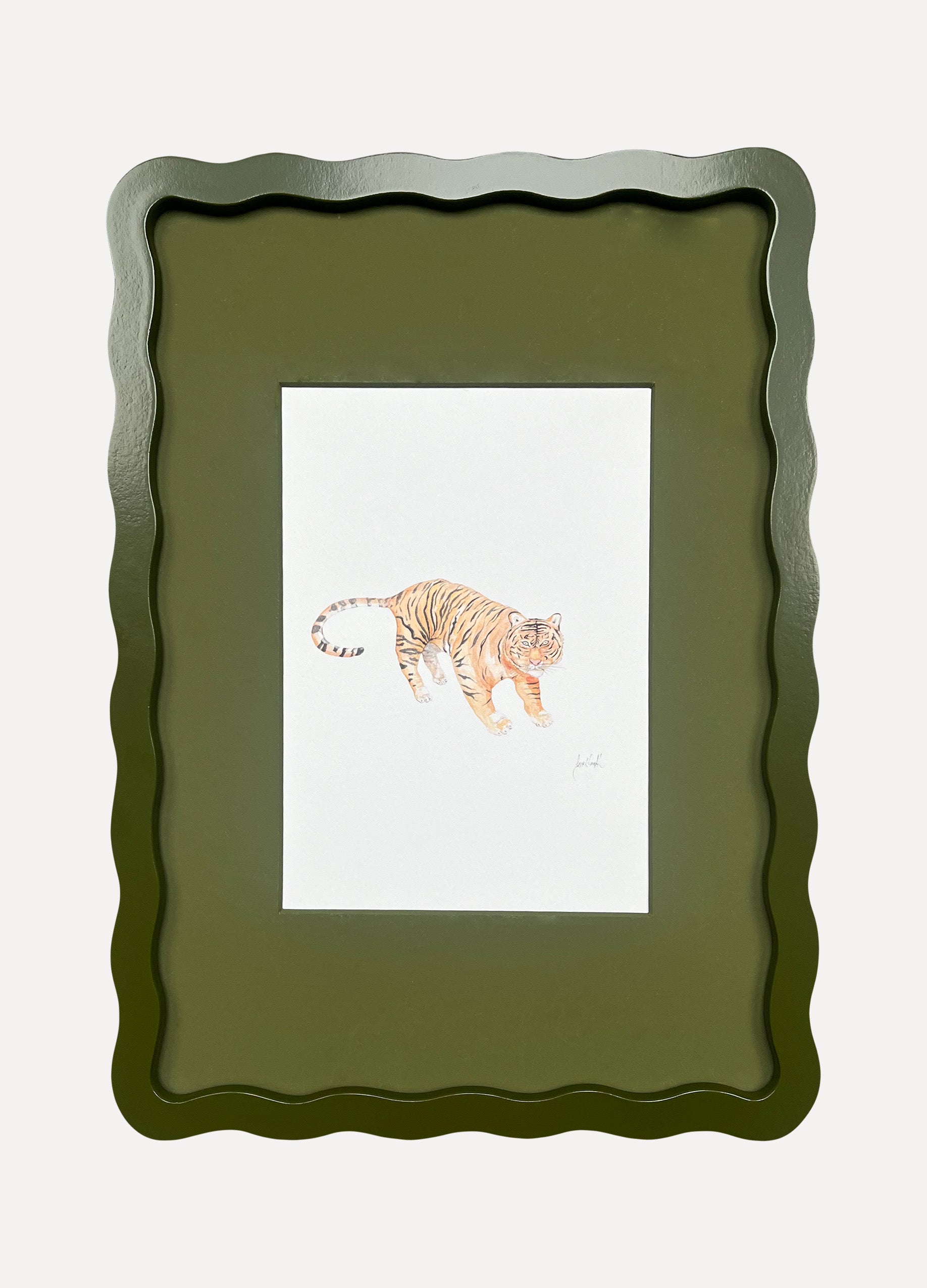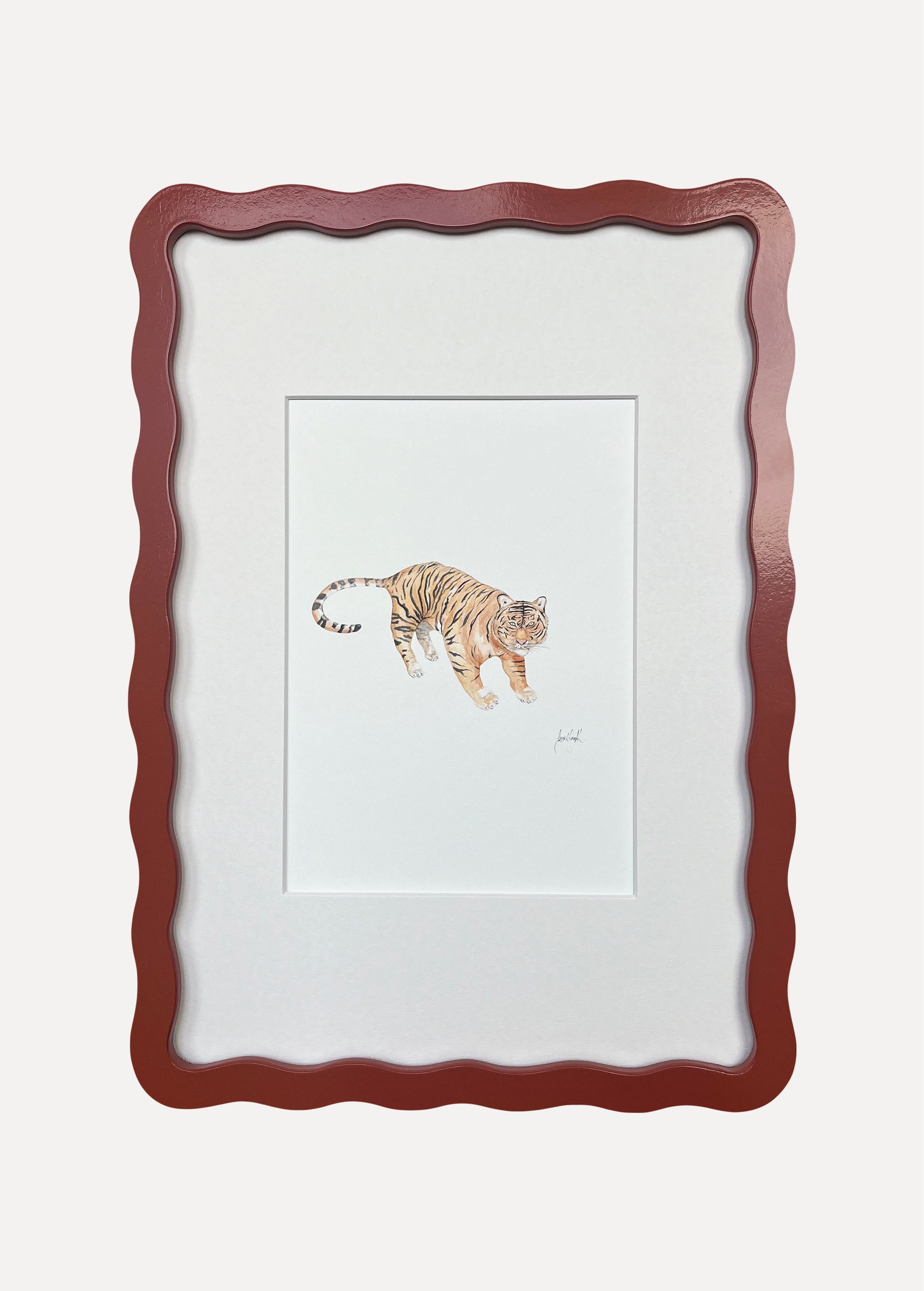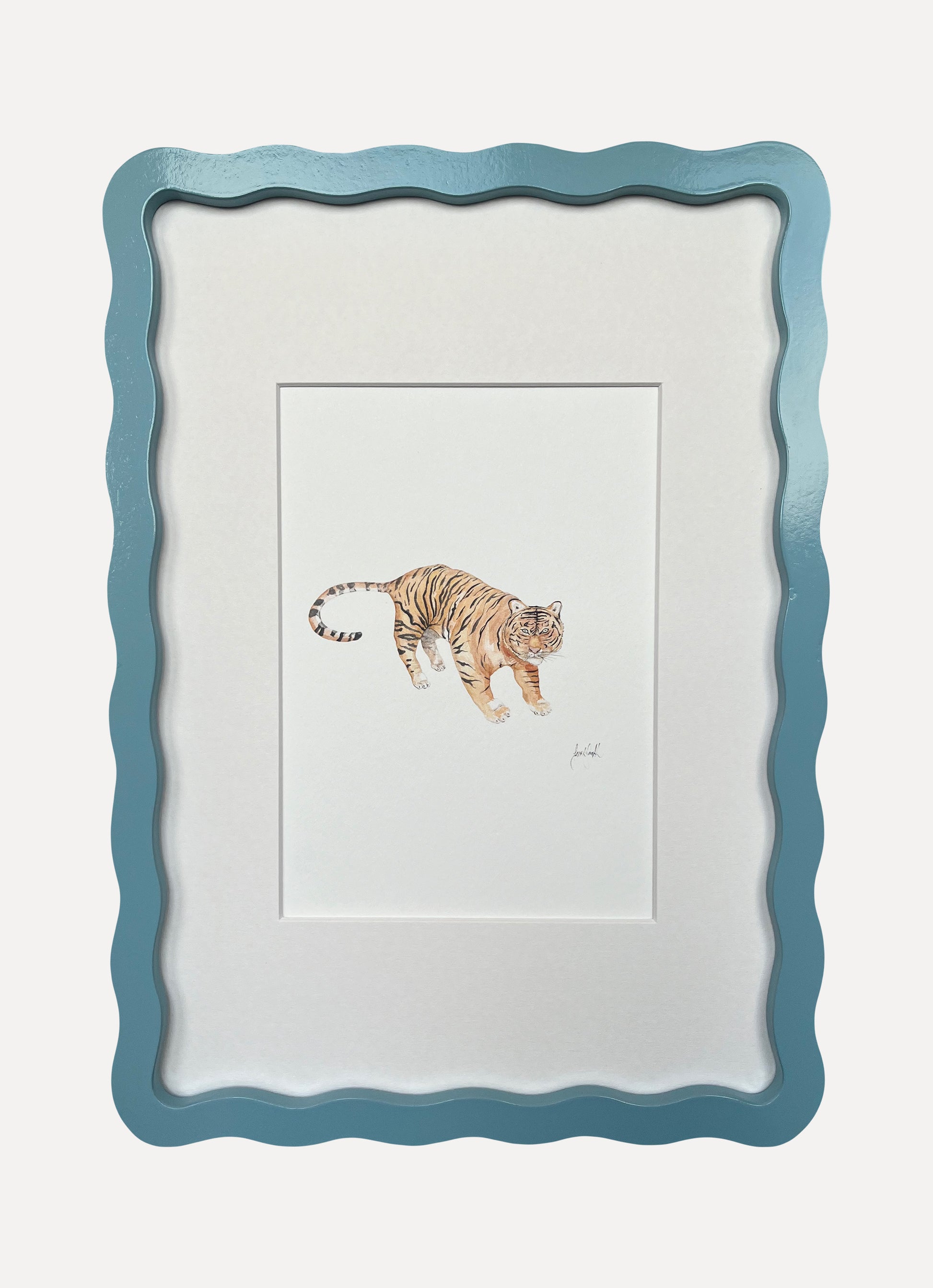 Sarah Smith ‘Tiger’ watercolour print, framed in A4 Alma Frames Wiggles. Available in all six Alma colours, with snow white mount or upgrade to a matching mount. Glazed with real glass with brass fixings for hanging.