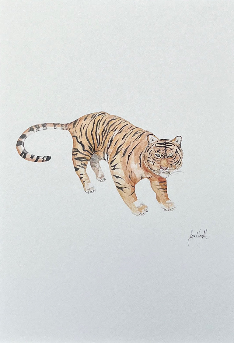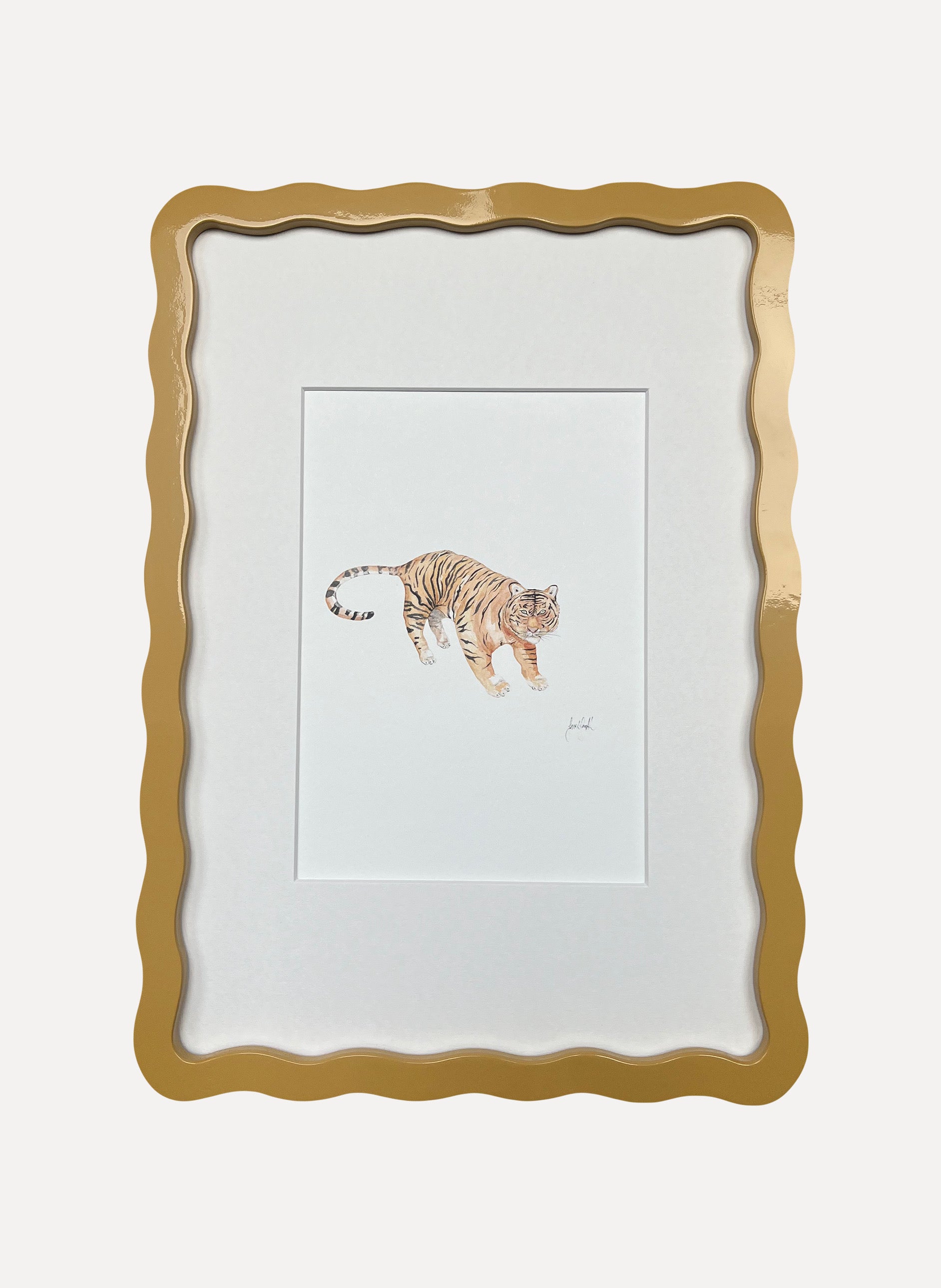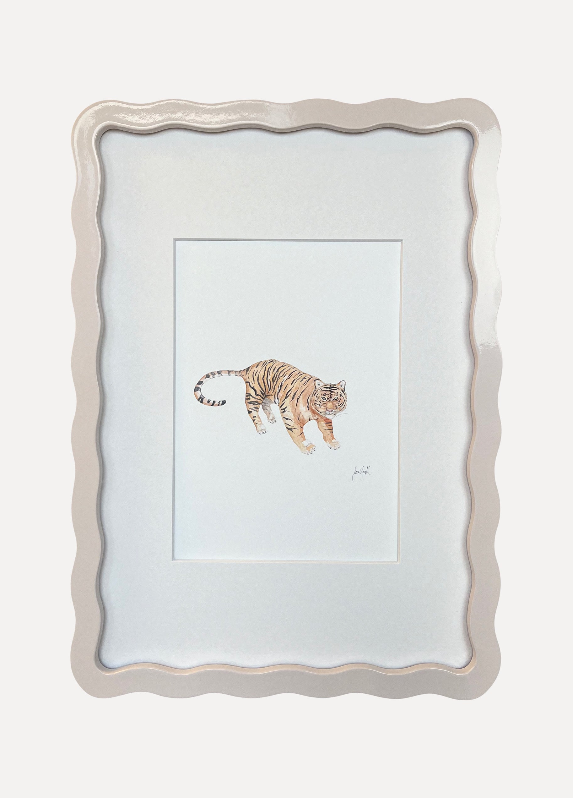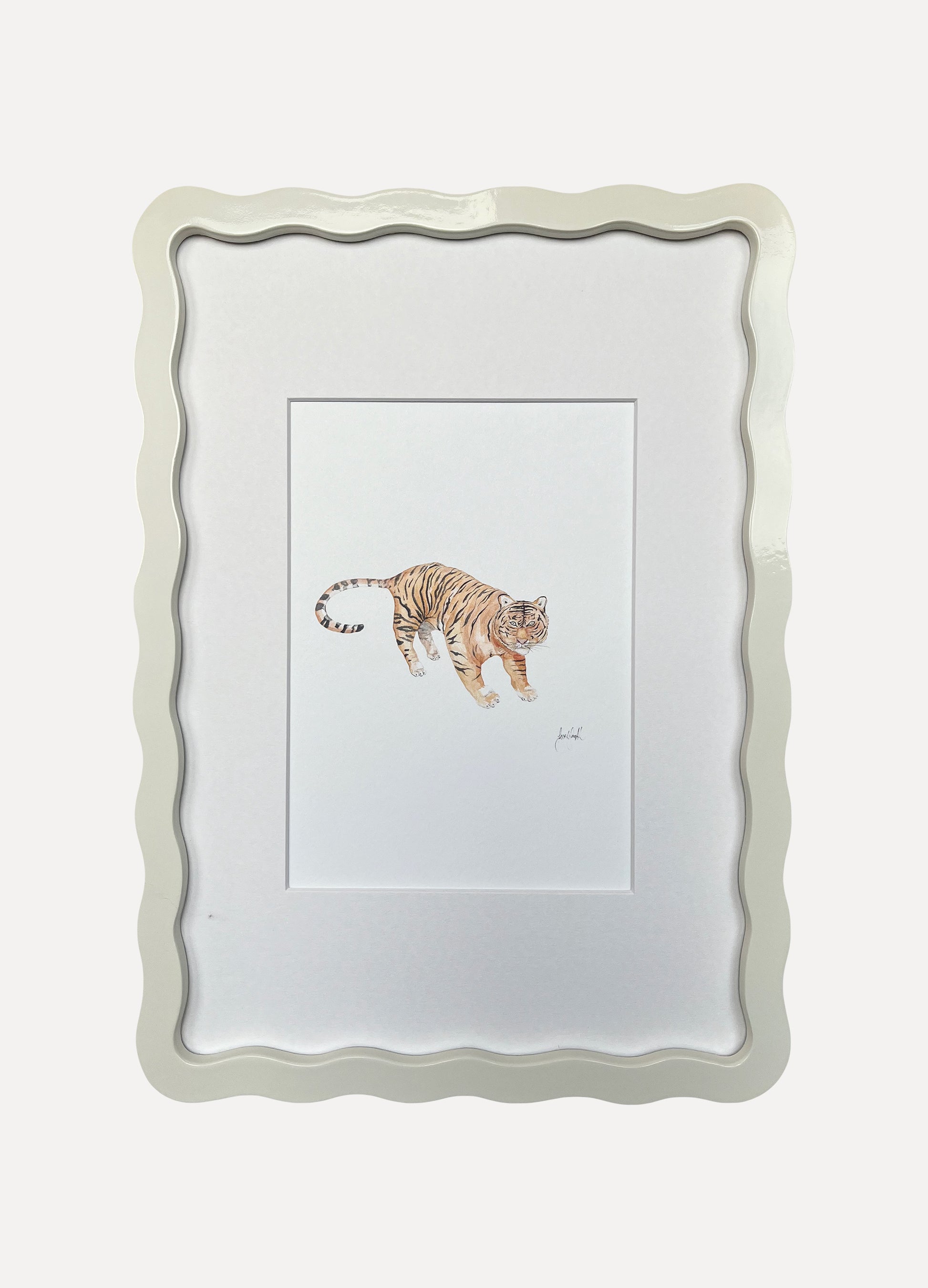 Sarah Smith ‘Tiger’ watercolour print, framed in A4 Alma Frames Wiggles. Available in all six Alma colours, with snow white mount or upgrade to a matching mount. Glazed with real glass with brass fixings for hanging.